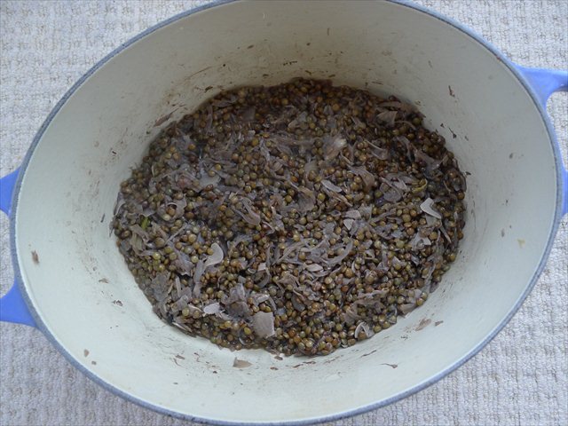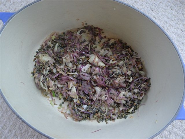 3) Add the water- the water should just cover the lentils. Bring to the boil, then reduce heat and simmer for 20 minutes, until the lentils are just cooked- be careful not to over cook the lentils- they want to tread the fine line between pliable, but avoid the terrain of mush. The water should have absorbed into the lentils. If there is too much liquid still in the pot, drain some out.