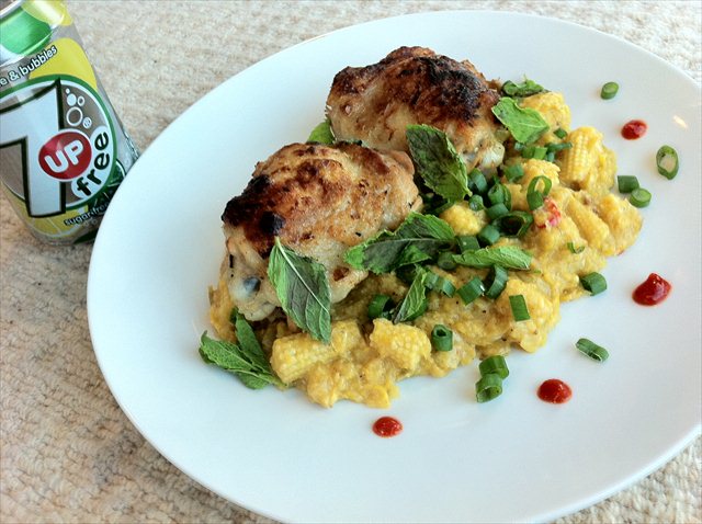 Chicken, corn and sweet lemon is actually a sound combination of flavours. Instead of spilling soda over your plate, braise the chicken in 7UP to add some tang and sweetness, not unlike the lemon chicken you ate in a local Chinese restaurant when you were eight. Mint and chilli contribute a much needed lift. It’s a little trashy, but it’s also a lesson on a plate. When life gives you lemons, the very least you can do is try to make something nice with lemonade.
