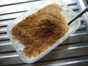 The second item is ground linseed meal. The Hungry One bought some home from the markets two weeks ago (from www.flaxfarm.co.uk). It’s low GI, gluten free and all those other things that sound good on a box. It’s also packed full of fibre, nutty and doesn’t taste like woodshavings. I wasn’t quite sure what to do with it. Until I started toying around with this.
