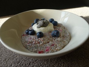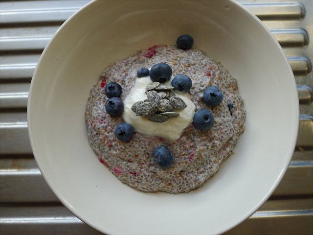 Linseed meal, chia, yoghurt, milk and a few stray smooshed berries for a little fruitness and flavour. They all hang out together in a tupperware in the fridge before melding into a silky, bircher-esque mass. It’s a low carb breakfast option that doesn’t involve lentils, bacon or eggs.