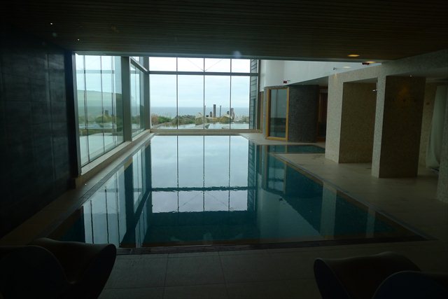 Our afternoon involves nothing more strenuous than a quick dip in the indoor pool, while we look out over the natural reed filtered pool outside (very pretty, but a touch cold). Later we take our complimentary pots of tea in the ‘relax’ room while the wine for our BYO dinner chills in the fridge at the bar (there are no minibars in the room).