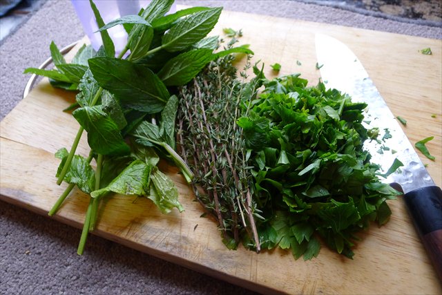 The green sauce is my chimichurri, but with mint and thyme instead of coriander and oregano, 3 fewer garlic cloves, no orange zest and the vinegars instead of orange juice.