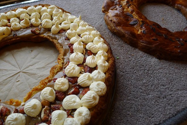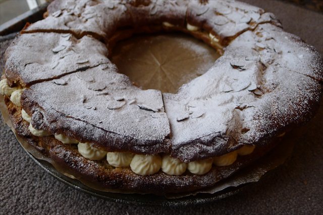 Inspired by the famous bicycle race from Paris to Brest, it’s a large circle of choux pastry, stuffed with creme patisserie, chantilly cream- and nuts. The creme pat here has been flavoured with espresso. I started with two shots and then realised that for these fellows, no meek coffee flavour would do. Another two soon went in.
