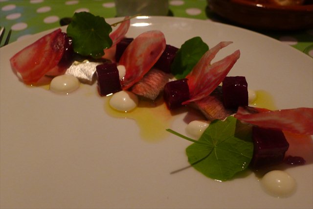 beetroots from the farm, dice of dark ruby and others slivered and raw. The slivers are a cross between stained glass windows and crisps. They’re partnered with Cornish sardines, lightly soused, dabs of yogurt and Nasturtium leaves. It’s smart stuff; sweetness and pickle walking hand in hand along the perimeter of a plate.