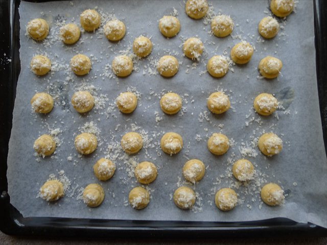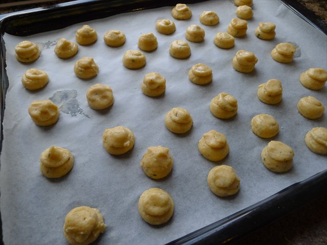11 ) I like to fix the baking paper to my baking tray with a little splodge of batter in each corner. This stops it shaking around when I start to pipe. Pipe  for three seconds, until you have balls about the size of baby bocconcini. Pat the top with a wet finger to push down any impertinent spires.