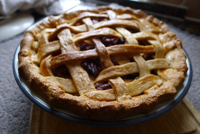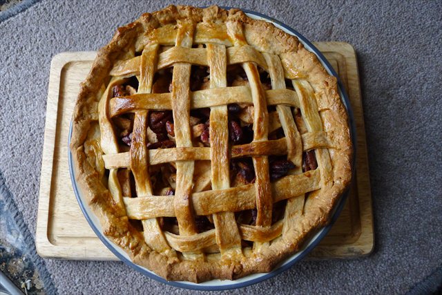 9) Lay the pastry over in a lattice, one over and one under. It’s easiest if you do half the pie at one time. There are excellent descriptions on how to create the lattice effect here and some step by step images here.