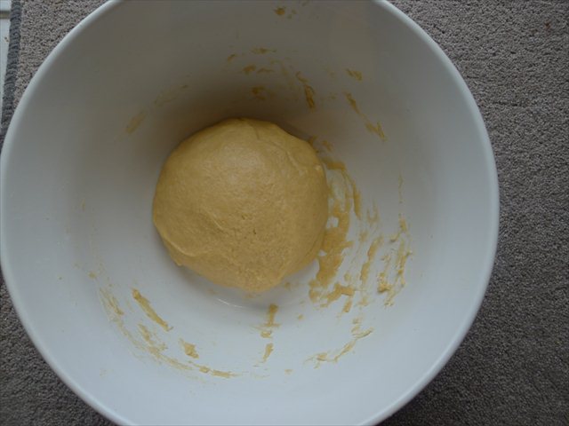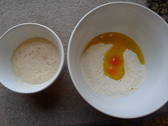 2) Sift the flour into the now-scummy-looking yeast/sugar/milk cocktail. Add the egg yolks, butter and salt and mix with your fingertips to bring into a dough.