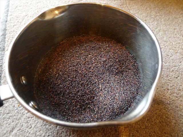 5) To make the filling, first grind your poppy seeds in a spice grinder. Then bring the milk to a simmer on the stove and add the ground poppy seeds. Stir well and cook for 3-4 minutes so the seeds absorb the liquid.