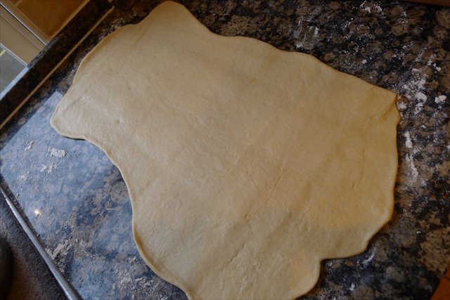 7) Once the dough has doubled in size lightly dust a work bench with flour. Roll out the dough to a rectangle, about the size of an A3 sheet of paper. If you can manage to make it taper down at the edges, all the better (this will mean when you fold them back in to protect the filling you won’t get a bulbous shape).