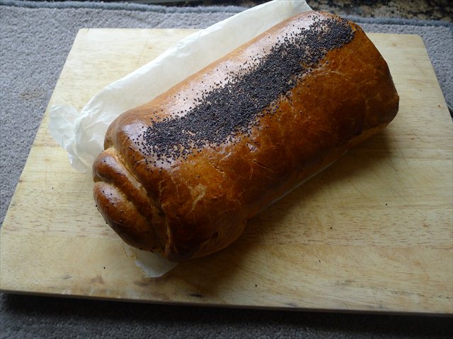 12 ) To bake preheat the oven to 180C/350 F and brush the loaf with beaten egg. Sprinkle a stripe of poppy seeds down the top.