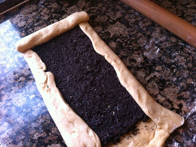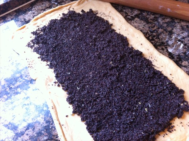8 ) Spread the poppy filling across the dough, leaving a 2 cm border at each side.