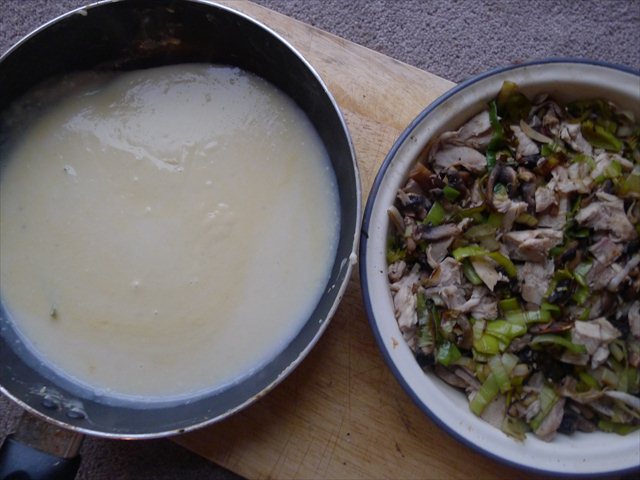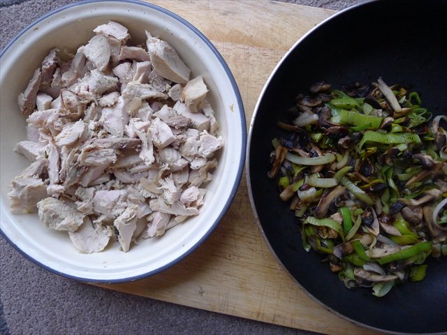 Perfect for leftover meat from big festive roasts; whether turkey or chicken. You could easily substitute the leek for brown onion and the mushrooms for spinach or diced carrot and celery.