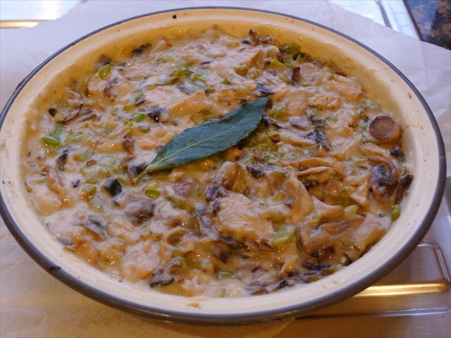 9) Gently combine it all in the pie dish and place the bay leaf in the centre (you don’t want to eat this, just for it to flavour the pie).