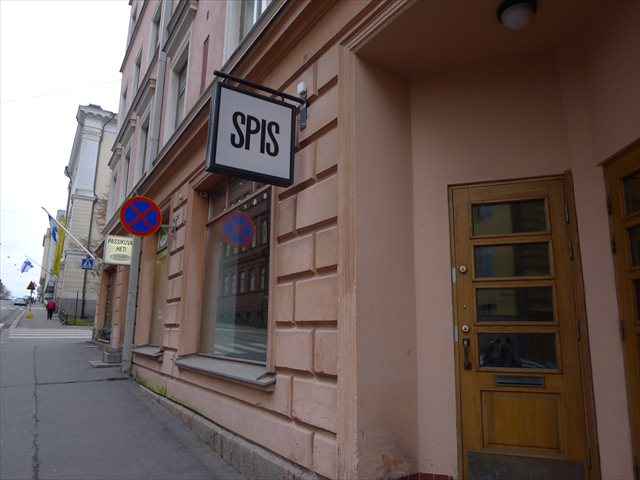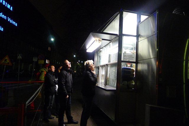 It’s an austere looking steel square shack tucked into a quadrangle behind the Finnish Parliament. It’s not the easiest spot to find on foot, though considering the queue of taxi drivers parked and waiting for their late supper in front, they should know the way.