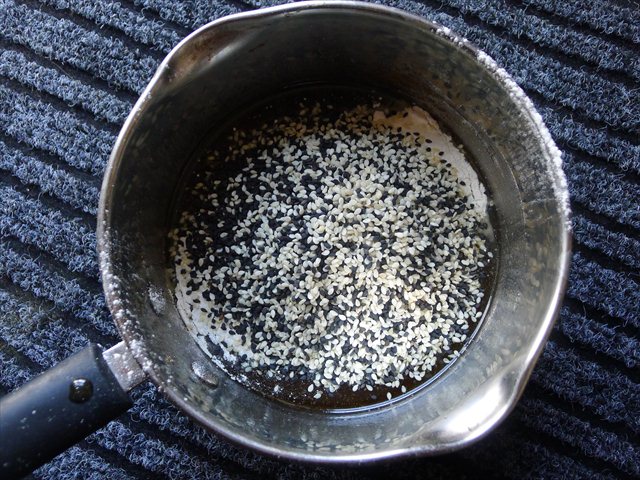 5) Sift in the flour and ground ginger. Add the sesame seeds, salt and pepper.