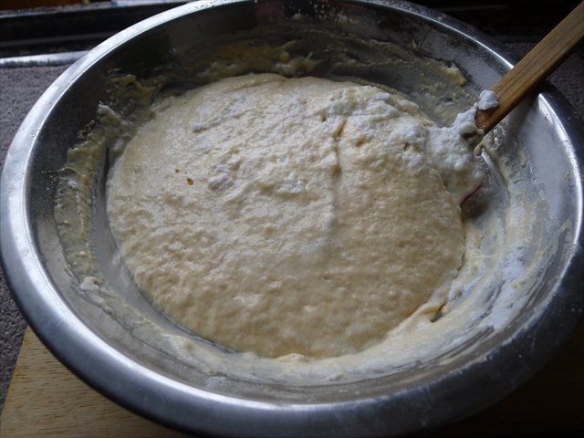 3) Add a quarter of the egg whites to the batter and fold to combine. This will help loosen the batter and make it easier to introduce the rest of the egg whites.