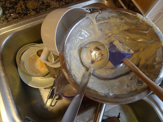 1 whisk. 3 mixing bowls. 1 or 2 frypans. 1 soup lade. 1 spatula.