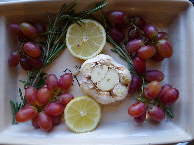 2) In a baking dish, about the size of an A4 sheet of paper place the grapes, rosemary and garlic.