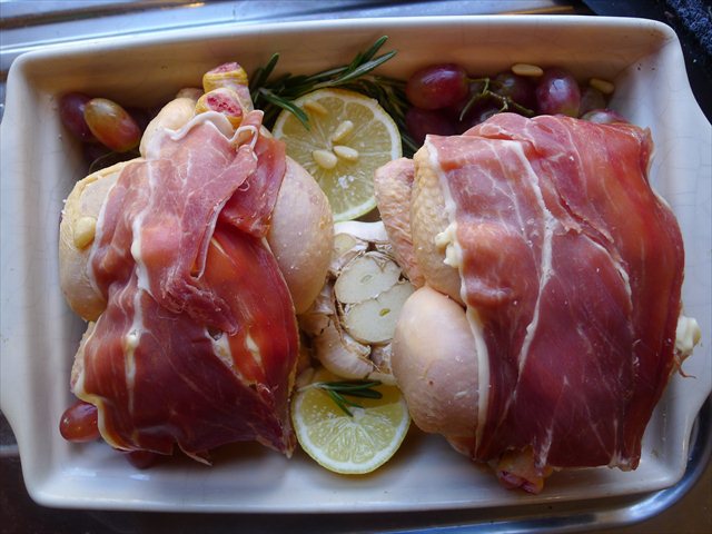 4) Lay the prosciutto/bacon over the breasts of the birds to protect them.