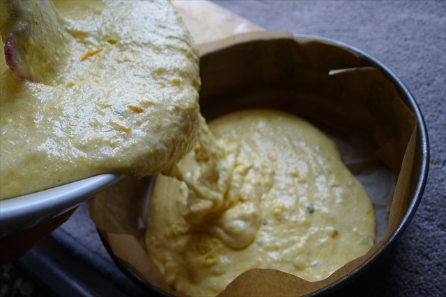 6) Alternate folding the polenta, almond meal and baking powder and the orange and olive oil into the eggs and sugar Start with the dry ingredients and end with the dry ingredients.