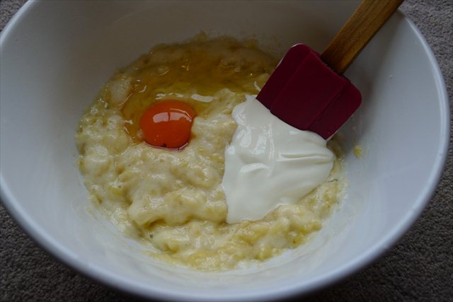 2 ) Muddle in the egg and the yoghurt, until you have a gloopy slurry.