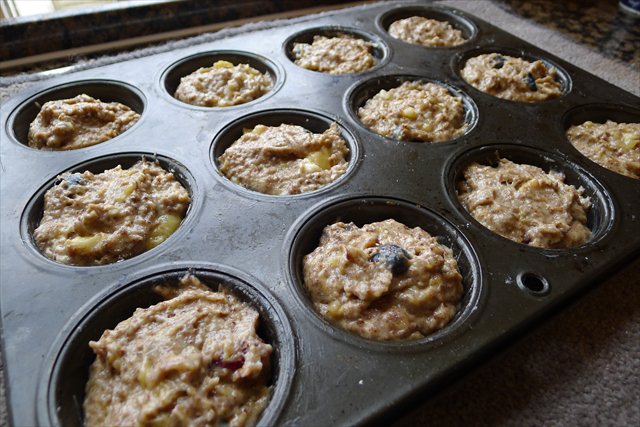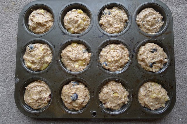6) Grease the insides of a 12 hole, one-third cup muffin tray and portion out the batter.