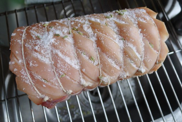 2) You don’t want more than 0.5 cm of fat underneath the skin. Any more than that and you will most likely have a degree of rubberiness to your crackling (and possibly more fat than most of us should ingest) . If there is more, open it up like a book and trim it out, before folding it back over and tying your roast.