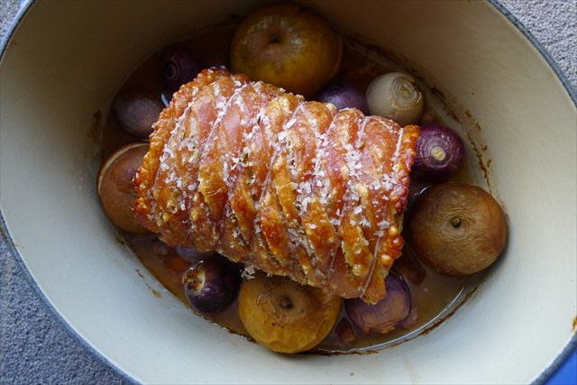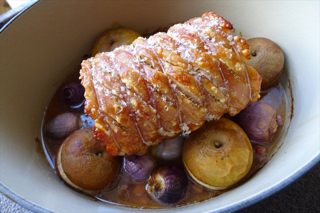 9) Roast the pork for 2 hours at the lower temperature, until the onions and apples have softened and you have a sweet porky jus at the bottom of the pot.