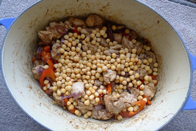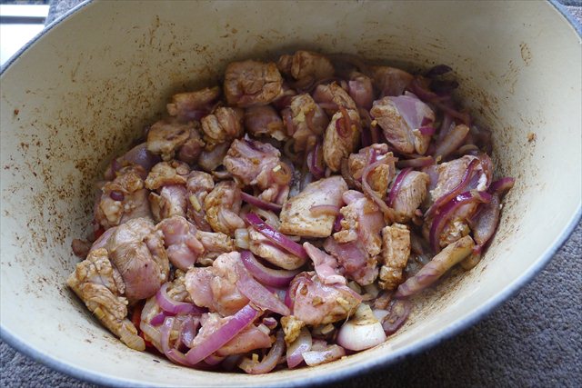 1) Place the Dutch oven over a medium heat. Add the spices and toast for a minute until they are nutty and fragrant. Add the olive oil and brown the chicken pieces.