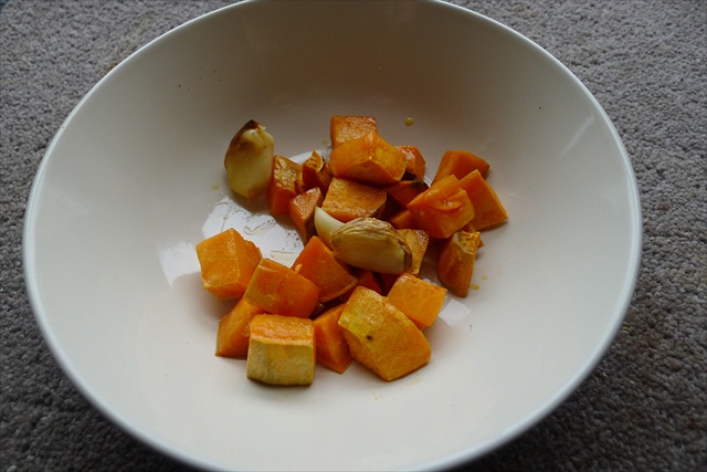 5) Take 1/3 of the sweet potato and the garlic cloves (minus their skins) and place in a bowl.