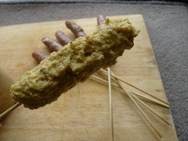 7) Insert a skewer into your cooked and cooled sausages and transfer your batter to a tall glass. Dip the cooled sausages into the centre of the batter-filled-glass. You may have to use your fingers to help encourage the batter to stick all the way along the sausages.