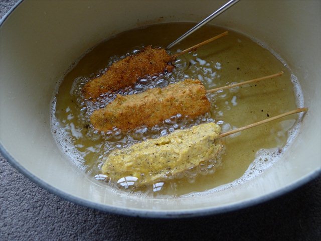 10) Trim your sticks so they are short enough to allow the corndogs to easily lie lengthwise in the hot oil. Fry the corndogs for five minutes, (turning them carefully after two and a half), until the batter is crisp and brown.