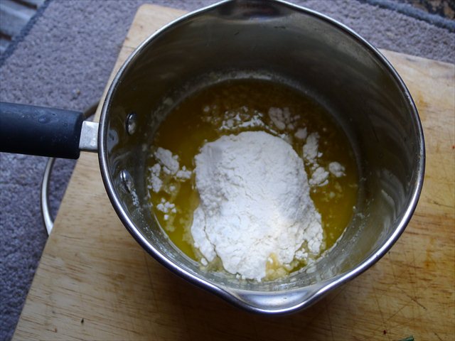 6) In a separate saucepan make the white sauce. Melt the butter and sift in the flour. Stir to create a roux, cooking over a medium heat until it is a light fawn colour.