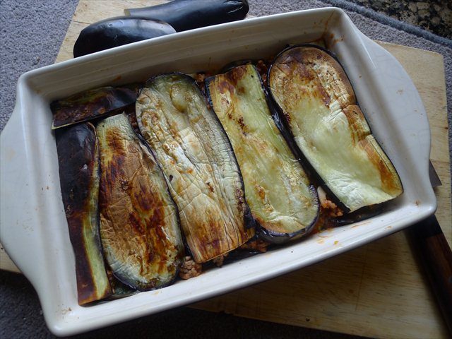 8) Grease a baking dish, the size of an A4 sheet of paper. Lay one third of the grilled eggplant across the base, top to tail to help fill all the corners.
