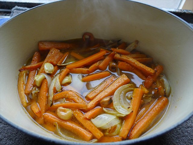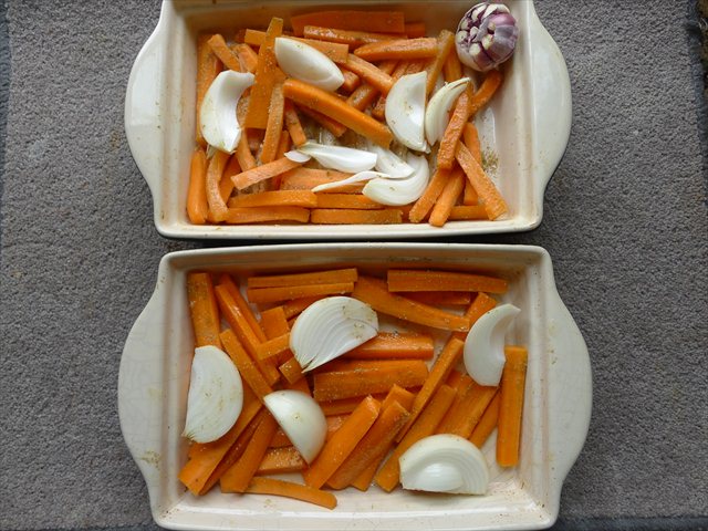 5) Bake the carrot, garlic and onion for 40 minutes, until the vegetables are soft and the carrots have gained some colour.