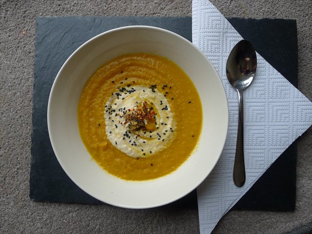 8) Serve the soup with a tablespoon or so of hummus swirled through the centre and some sesame seeds sprinkled over the top.