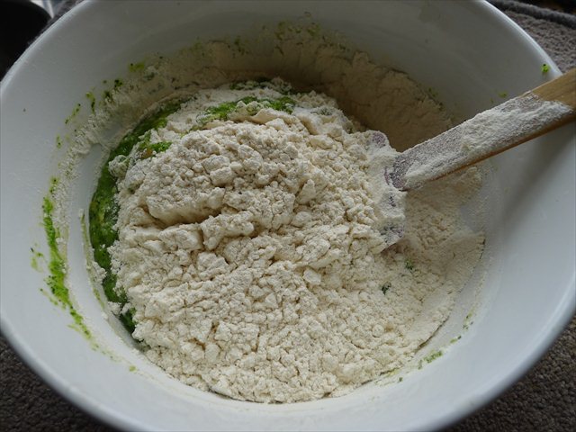 6) Mix the broccoli puree with the eggs, sunflower oil and the sugar. Stir to combine.