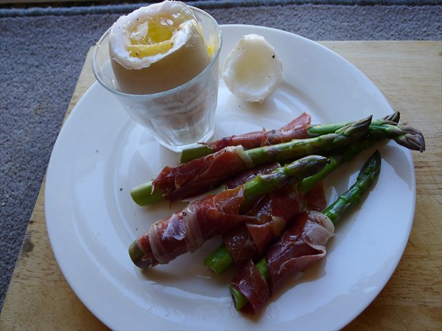 By submerging a room temperature goose egg into water that’s at a rolling boil for around 7 – 8 minutes should ensure a cooked white and runny yolk (if you want to substitute a hen, go for 5 min 15 seconds). All that’s left to do is steam your asparagus and then wrap it in ham, and then you’re ready to take the plunge.