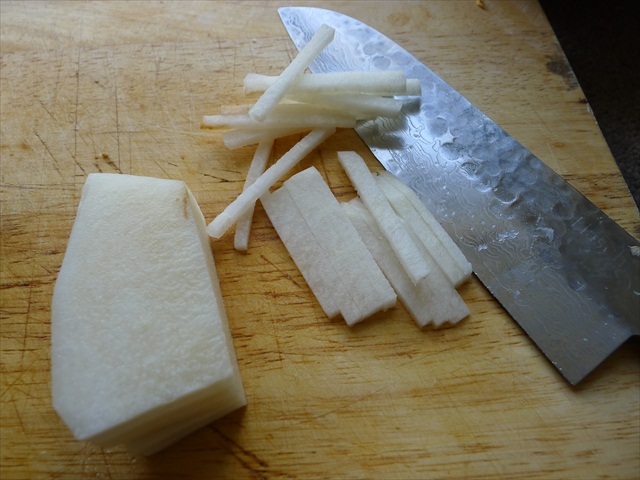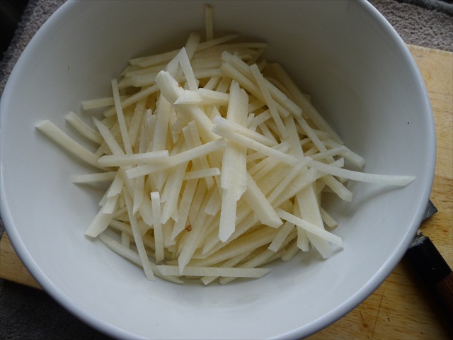 2) Use a mandolin or a sharp knife to cut into thin matchsticks.
