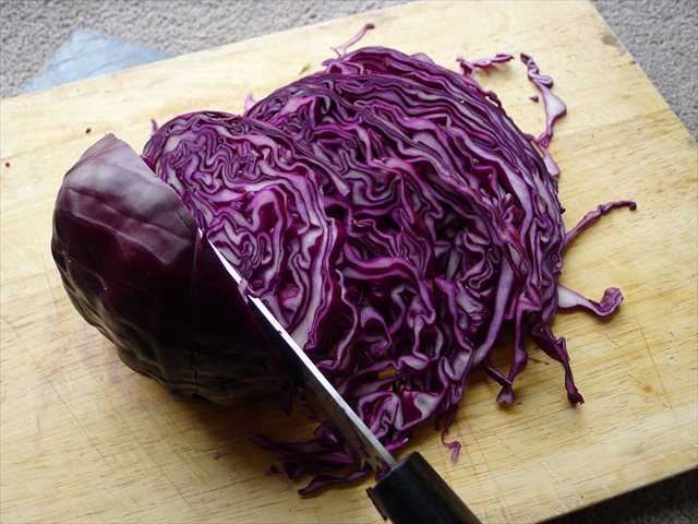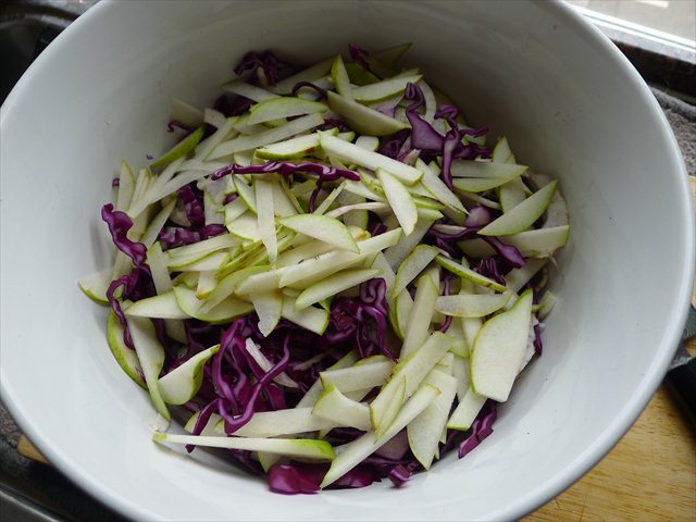 2) To make the slaw slice the red cabbage as thin as you can, so it forms slim ribbons. If you have a mandolin, or a food processor, you might want to whip that out.