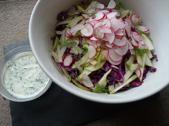 5) To make the dressing for the salad whisk together the yoghurt, apple cider vinegar and the chopped chives. Season with a little salt and pepper.