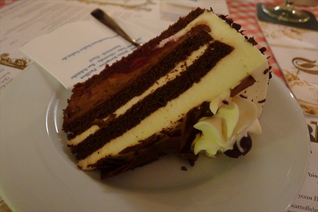 By 1.30 pm, the inside is heaving. This place is popular for a reason. The torte is a stellar example. Like Cafe Hoffman it begins with a crisp biscuit base, this time dressed with cherry puree. Above that is chocolate sponge, studded with cherries, chocolate mousse, vanilla sponge, cream, chocolate sponge and then a cloud of sweet whipped cream, prettied up by waftings of dark chocolate. The winning aspects here are the inclusion of mousse and vanilla sponge. It’s a multitude of textures and tastes, though once again, it’s the excesses of cream which muffles the intensity of the chocolate and the kirsch.