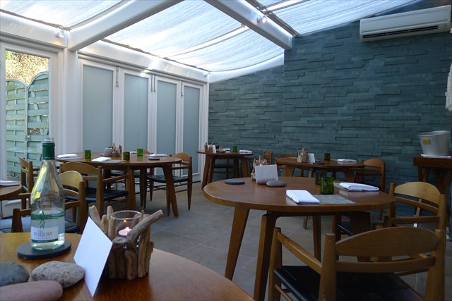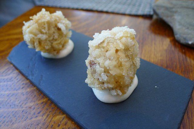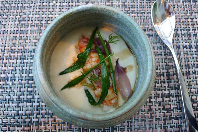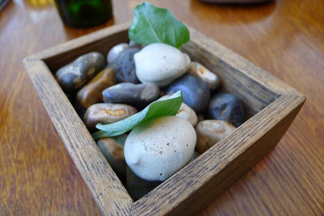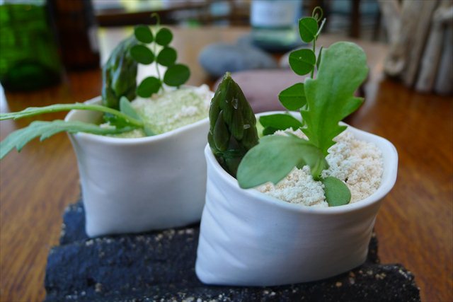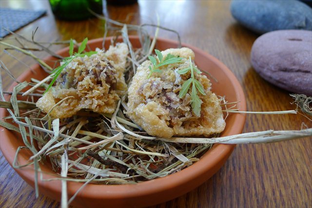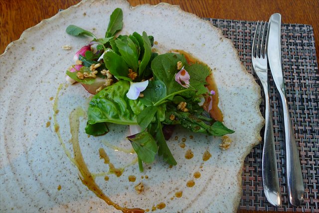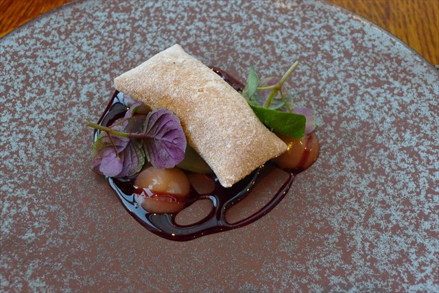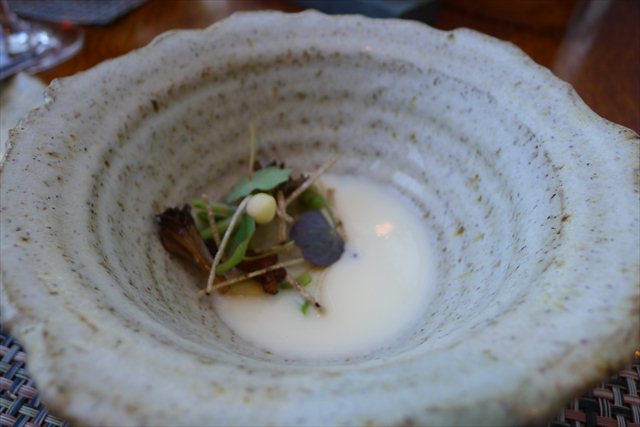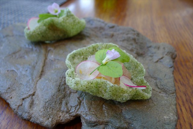 The interior of the restaurant manages to be both modern and earthy, from the stone floors and walls, dark wood tables, squat chairs and table accents of sticks and stones. The rear extension looks straight out onto the garden, with sunlight streaming in. Here the water glasses are fashioned from recycled wine bottles and the dress code is simply smart. There’s no need for mucking about with jackets and ties (there were a few gentlemen in sports jackets, but a nice shirt and trousers seems to be just fine). This is a place that invites you to sit back and be swept along on a gentle journey- the road map for which waits in an envelop on your table. It’s a listing of the 17 courses to follow, in efficient language; it’s more a listing of components in the dish than a breathless ode of what may follow.