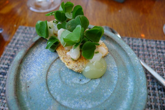 The other thing that you come to appreciate when you’ve spent far too many months of mortgage payments (and hours of your life) sitting down to outrageous meals is consideration in portion sizes. Heaving yourself away from a table at 11.30 pm, only to spend the rest of the night shallow breathing and trying to sleep in a half sit up position after 17 generous plates is frankly Falstaffian. So thank you, L’Enclume, for being sensible about this. Most of the fresh flavours that prance across the table can be consumed in three to four bites. And if there is a richer course; it’s presented in a restrained way. The double act of the raw prawn with wood sorrel and grilled prawn with onion is a perfect example. It starts with a pintxos style cracker, boasting a tartare of sweet raw prawn and the sweetness of an apple gelee that sits on the lid of a beautiful grey ceramic pot.