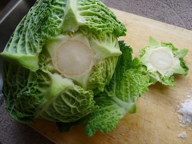5) Start creating your cabbage rolls. First cut the woody base of the root stem from the centre of your blanched leaves. Discard.
