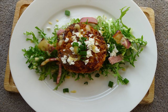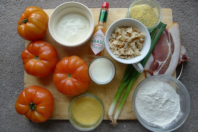 8) To make the salad combine the frisee with the crisped bacon, chopped scallions and crumbled feta. Top with a few of the fried green tomatoes. Mix together the mayonnaise with the tabasco- if you like things hotter, add a little more. Drizzle over the top and serve straight away. This can either be plated individually, or on a long platter for sharing.