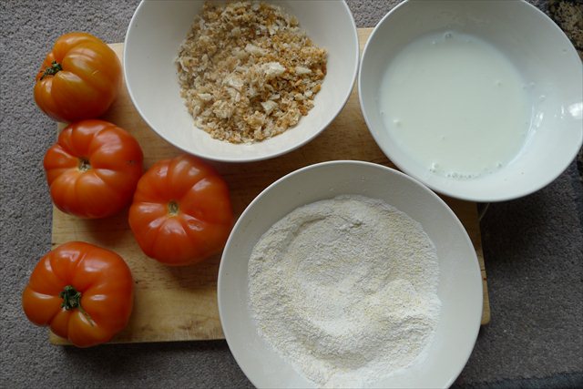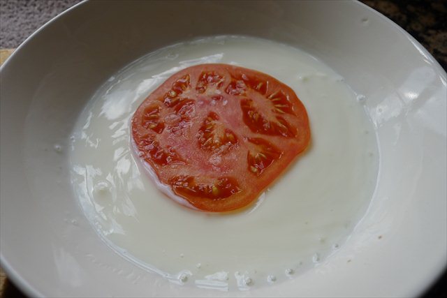 4) Keeping one hand clean, place a tomato slice in the milk/yoghurt mix.