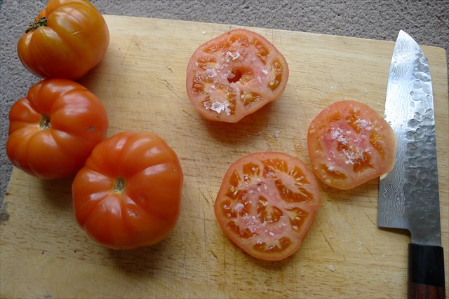 2) Slice your tomatoes horizontally into slices 1-1.5 cm thick, discarding the top and bottom and stem. Season with a little salt and set aside for a few minutes. This will help draw extra liquid out of them.