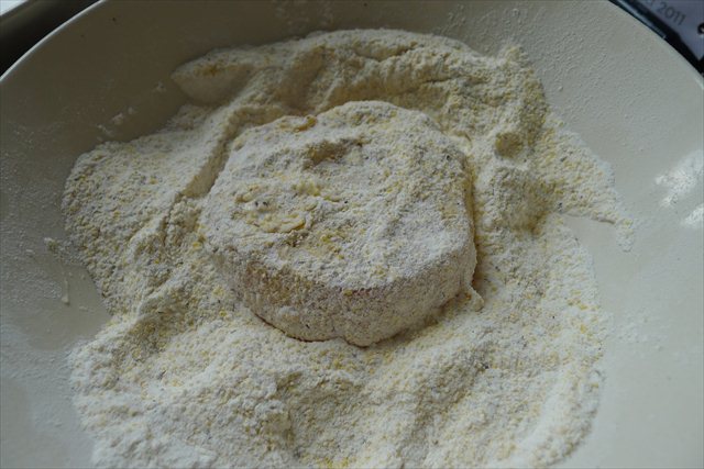 1) Set up three bowls. In one bowl place your breadcrumbs. In the second mix together the yoghurt and the milk. In the third bowl mix together the flour and the cornmeal.