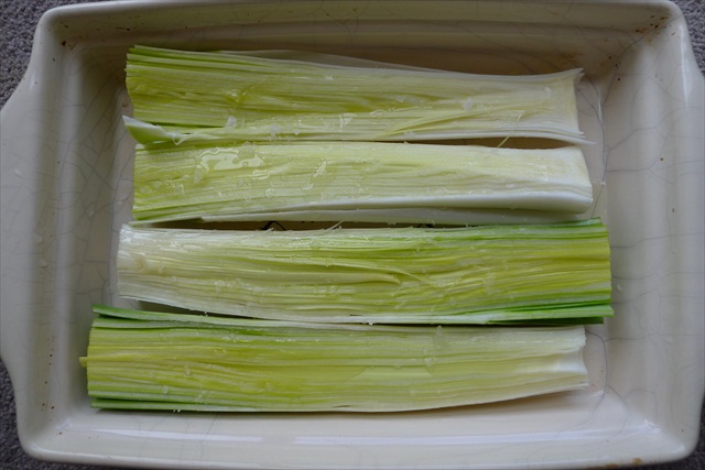 2) Place the washed, trimmed and halved leeks cut side up in a baking dish. Add the four tablespoons of water and cover with foil. Bake for 15 minutes. Remove the foil, drain the water and drizzle with olive oil. Bake for another 15-20 minutes, until soft and lightly burnished on top. Set aside.